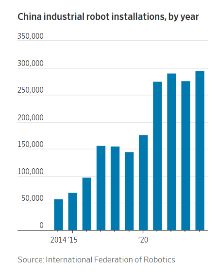 根据国际机器人联合会的数据,中国去年安装了29.5万台工业机器人,是美国的近9倍,超过全球其他国家总和。
