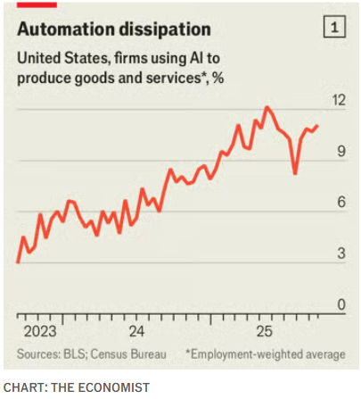 美国人口普查局的研究人员,询问企业在过去两周是否在“生产商品和服务”中使用了人工智能。我们估算,按就业人数加权,美国人在工作中使用人工智能的比例最近下降了一个百分点,目前为11%。在员工超过250人的大型企业中,AI的采用率大幅下降。