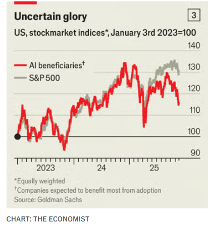 高盛编制了一个指数,追踪那些“因AI带来生产力提升而对基础盈利预期变化最大”的公司。这个指数包括了福特、报税公司H&R Block以及新闻集团等积极推进AI计划的企业。长期以来,这些公司的股价走势与整体市场一致。但最近,这一指数开始落后。