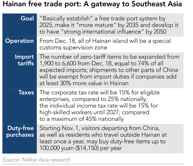 今年7月,政府公布了具体运作细则。新政策对74%的进口商品实施零关税,同时对符合条件的企业实施15%的企业所得税率(中国其他地区为25%),并对高技能人才给予15%的个人所得税率优惠。
