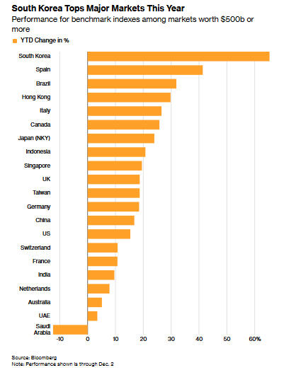 从某种程度上看,这一政策起到了作用:大量新散户的涌入推动了韩国KOSPI指数今年大涨68%,在全球主要市场中表现居首。