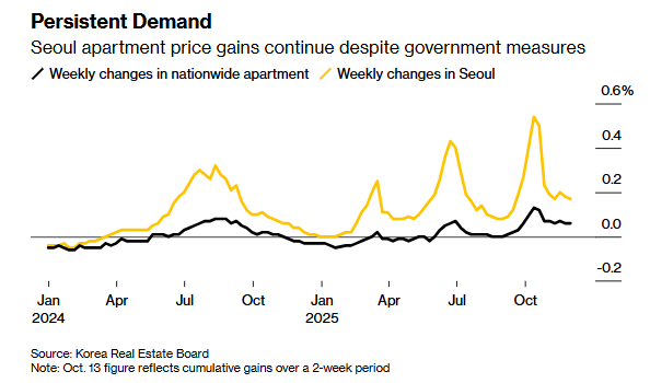 李在明总统也称房地产市场是“一触即破的泡沫”。自6月上任并承诺改善住房可负担性以来,他已出台多项打击投机行为的措施,尽管目前效果仍有限。