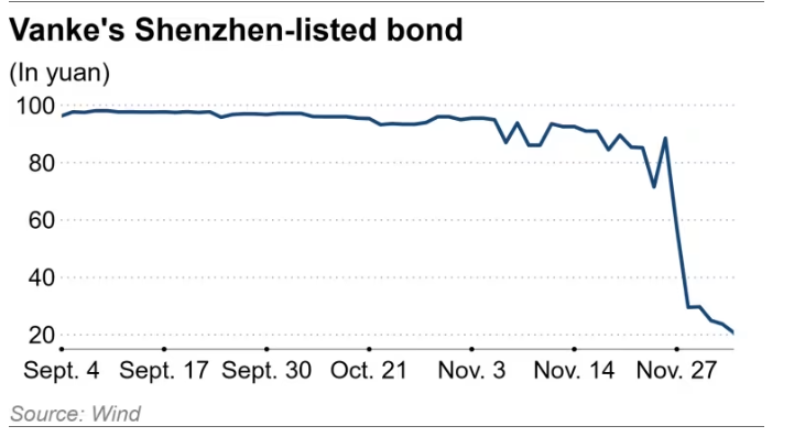 随着外界对万科偿债能力的担忧加剧,公司公开发行的债券价格暴跌逾50%,其中一只债券上周五以每张面值100元中的约20元成交。
