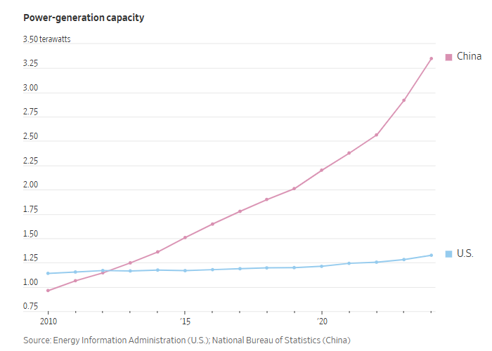 去年,中国发电量超过美国两倍。一些中国数据中心的电价甚至不到美国数据中心的一半。