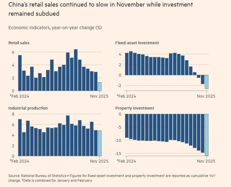 高盛分析师表示,“11月整体经济活动数据普遍未达市场预期,尤其是零售销售表现疲弱”。他们指出固定资产投资增长“仍显低迷”,11月单月同比下滑10.7%,略好于10月的11.4%降幅。