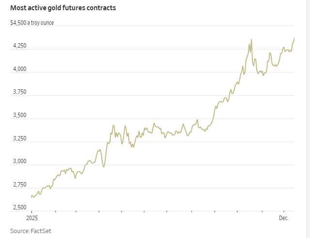 黄金和白银表现依然突出。现货黄金价格变动不大,但黄金期货上涨0.2%,不过未能刷新历史高位,今年以来贵金属的强劲涨势仍在持续。最活跃的黄金期货合约收于每盎司4335.20美元,距离历史收盘高点不到1%。当前的收盘纪录略高于每盎司4359美元,创于10月20日。