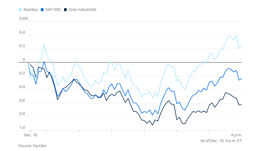 纳斯达克综合指数周二尾盘反弹,小幅上涨0.2%,结束连续三日下跌走势,此前盘中一度下跌近0.6%。标普500指数下跌0.2%。道琼斯工业平均指数下跌302点,跌幅为0.6%。