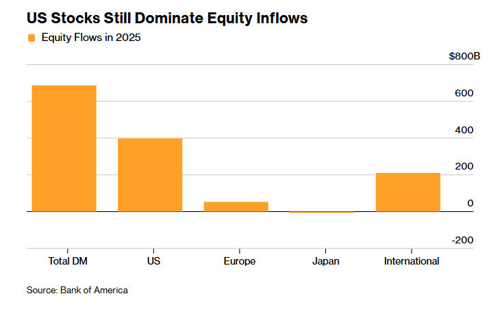 美国银行的数据也表示,投资者正以接近纪录的速度向美国股票市场注入资金,以提前布局2026年,看多的因素包括更低的利率、关税下调以及减税政策。美国银行在一份援引 EPFR Global 数据的报告中称,截至12月17日当周,美国股票市场吸引的资金流入接近780亿美元,这是自一年前创下822亿美元纪录以来的最高水平。科技板块三周来首次对资金流入作出贡献。