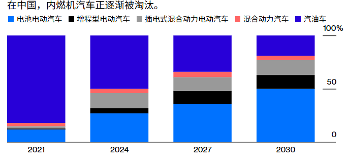 事实证明,万钢的预判十分准确。根据咨询公司Alix Partners的数据,2021年电动化汽车在中国销量中占比仅为18%,而三年后的2024年这一比例已跃升至50%。预计到2030年将进一步升至81%。
