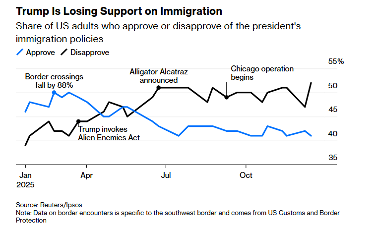 在2025年大部分时间里,特朗普挥霍了公众在他最具优势议题上的支持,移民。