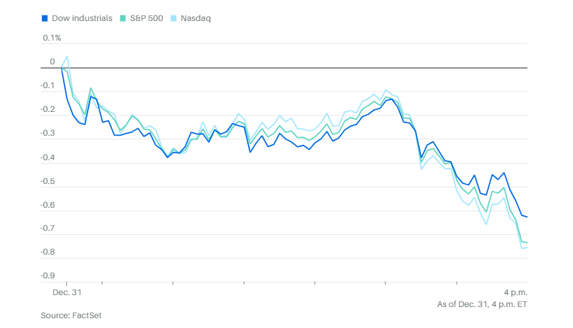 美股实现连续第三年上涨,但最后一天以小幅下滑收官。周三道琼斯工业平均指数下跌304点,跌幅0.6%。标准普尔500指数下跌0.7%。纳斯达克综合指数下跌0.8%。三大指数都是连续四个交易日下跌。这是自1971年纳斯达克创立以来,三大指数首次在同一年结束时同时出现至少四天的连跌。