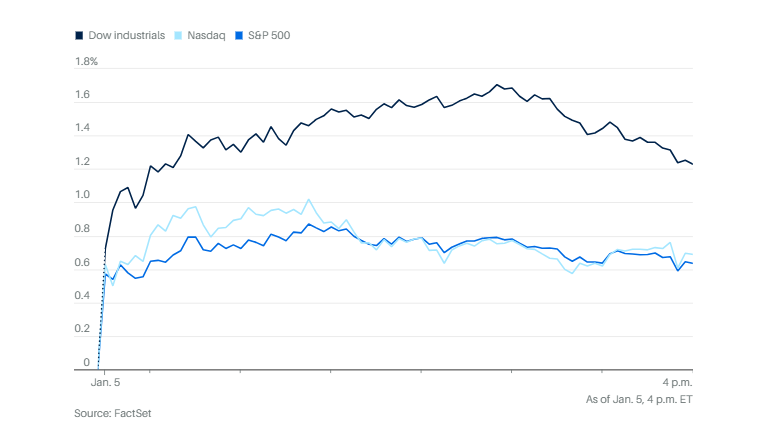 圣诞老人姗姗来迟。道琼斯工业指数创下历史最高收盘纪录,上涨近600点,涨幅1.2%。标普500指数上涨0.6%,纳斯达克综合指数上涨0.7%。盘中道指一度升至49,209.95点,随后略有回落。等权重的标普500版本上涨更高,涨幅0.91%。中小盘的罗素2000大涨1.58%。