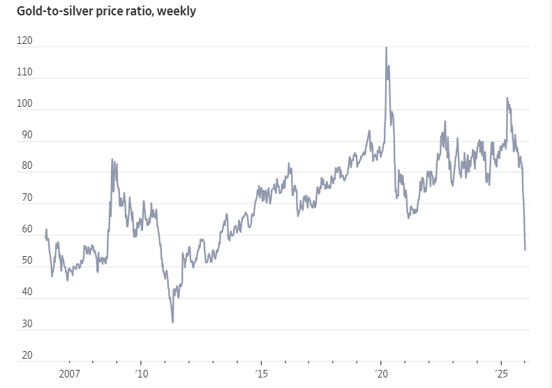 尽管黄金近期也创下历史新高,周二收于4482.20美元/盎司,但购买一盎司黄金所需的白银数量正在快速降低。近期两种贵金属的交易价格,使黄金/白银比值降至约55,为13年来最低水平。比值越高,意味着投资者更偏好黄金,因其更具“避险属性”;而白银具有更多实际用途,例如医疗器械、汽车、餐具和太阳能电池板,因此价格更容易随经济波动。