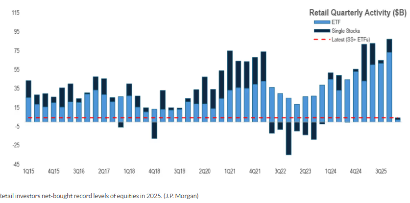 分析方面,散户投资者短期内并未退出市场。根据摩根大通的数据,2025年散户资金流入创下新纪录,个人投资者净买入个股和ETF的规模接近过去五年平均水平的两倍。尽管在12月最后一周交易有所放缓,但新年伊始,散户强势回归。1月第一周的买入量,为近八个月以来第二高的一周。