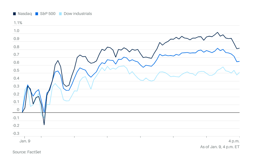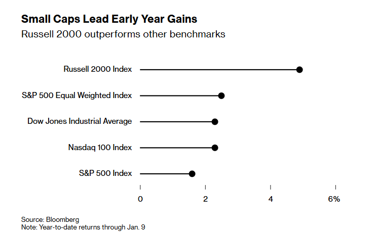 一份好坏参半的就业报告公布后,道琼斯工业平均指数和标准普尔500指数在周五收于新高,投资者在新年第一周涌入股市。道琼斯指数上涨238点,涨幅0.5%,标准普尔500指数上涨0.7%。纳斯达克综合指数上涨0.8%,但仍远低于历史高位。中小公司的罗素2000指数在周五上涨0.8%,本周涨幅超过三大指数,显示投资者正在从热门科技股撤出,转向市场中的其他板块。