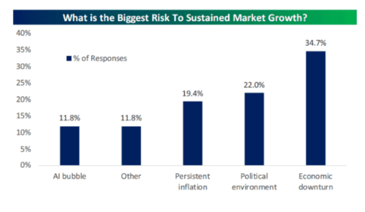 许多人可能会惊讶地发现,选择“人工智能泡沫”的受访者还不到12%。相反,超过三分之一的人担心经济下行,22%担心政治环境,19.4%则对持续的通胀感到忧虑。