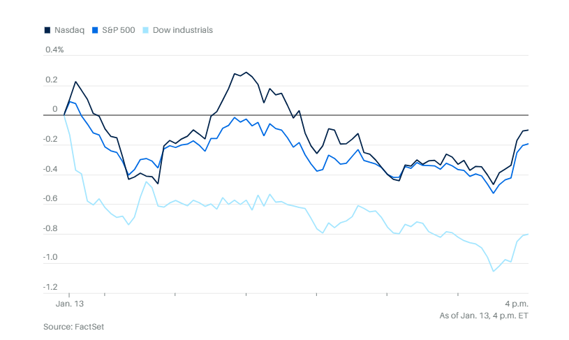 周二,受财报季开局表现不佳影响,美股从盘中高点回落。道琼斯工业指数下跌398点,跌幅为0.8%。标普500指数下跌0.2%,纳斯达克综合指数下跌0.1%。三大指数在尾盘最后半小时有所回升,脱离当日低点。