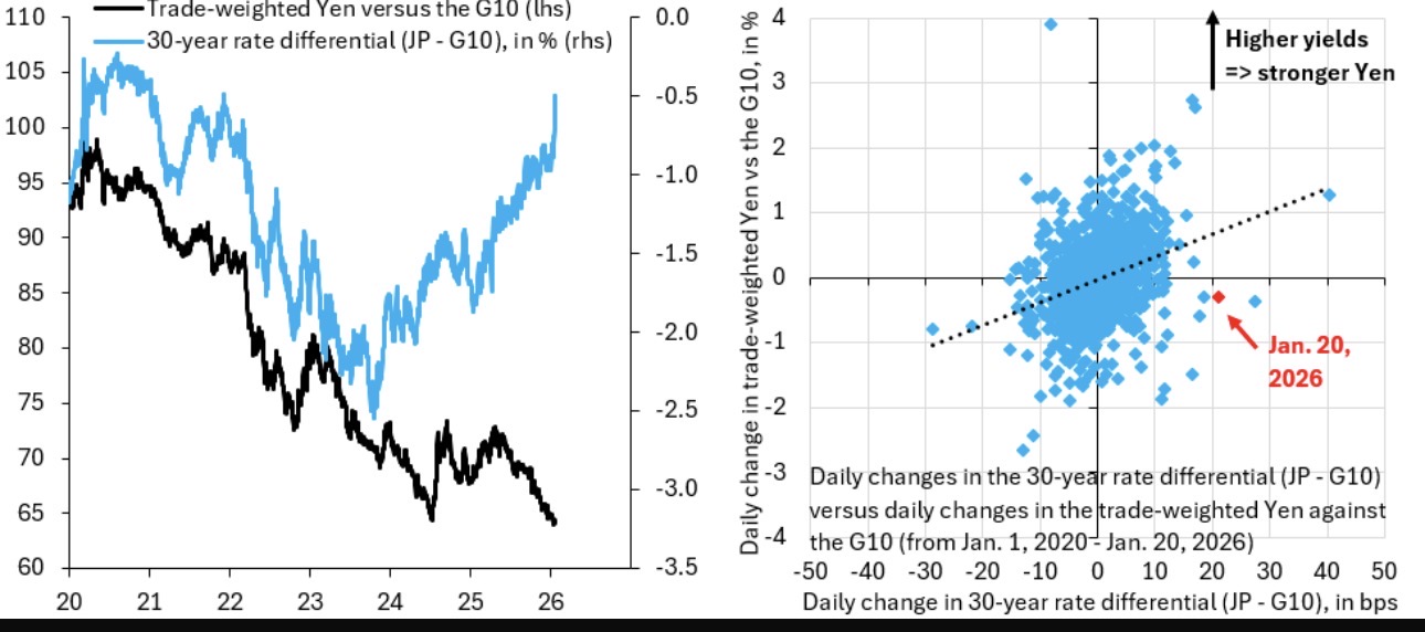 上图左侧的蓝线显示日本与其他G10国家之间的30年期利差。黑线是日元相对G10货币的贸易加权指数,两者采用相同权重,可直接对比。右图展示的是同一数据的日度变动,利差变化(横轴)以基点表示,日元变动(纵轴)以百分比表示。