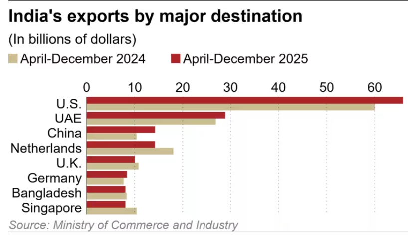 在寻求出口市场多元化的同时,印度正在积极与多个国家达成贸易协议,以减轻美方关税带来的影响。上月,印度与新西兰达成所谓的“自由贸易协定”;此前,莫迪总理12月访问海湾国家期间,印度与阿曼签署全面经济伙伴关系协议;数月前,印度还与英国签署贸易协定。