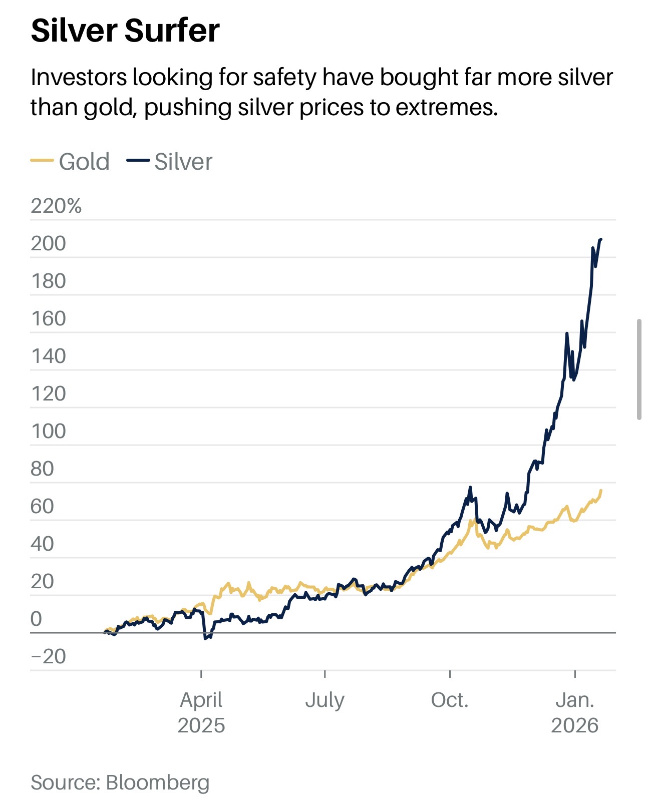 黄金过去一年上涨了74%,虽然也很可观,但远远落后于白银的抛物线式暴涨。
