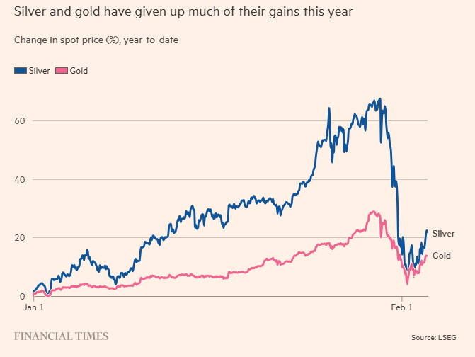 这轮剧烈的涨跌行情被比作新冠疫情期间的“迷因股”狂热。上周四,白银价格一度突破每盎司120美元,但随后暴跌逾40%。周二价格又反弹了9%,市场剧烈震荡。