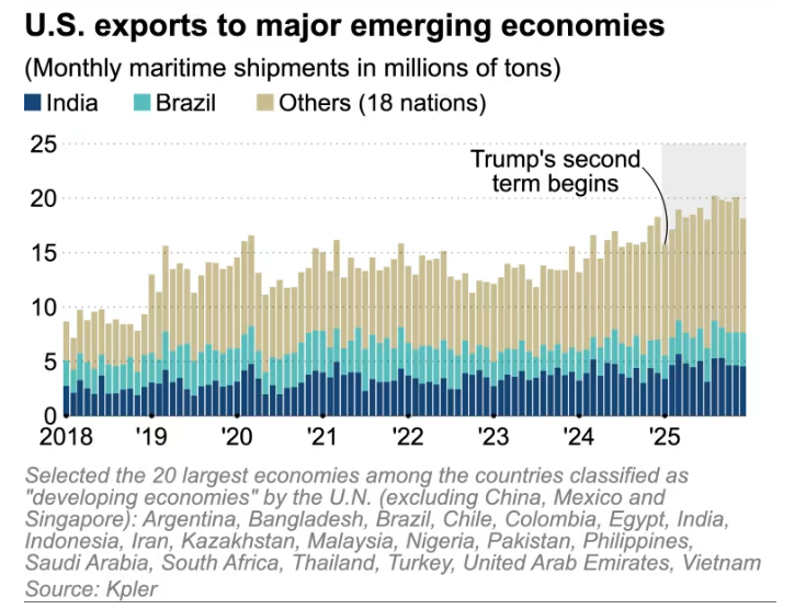 《日经亚洲》援引贸易信息机构Kpler的数据,分析了美国对巴西、印度、马来西亚、越南等20个主要新兴经济体的出口情况。分析显示,2025年美国对这些国家的海运出口总量从2024年的1.9亿吨增长至2.23亿吨,部分亚洲国家的玉米与大豆进口激增,在一定程度上抵消了对中国出口的显著下滑。