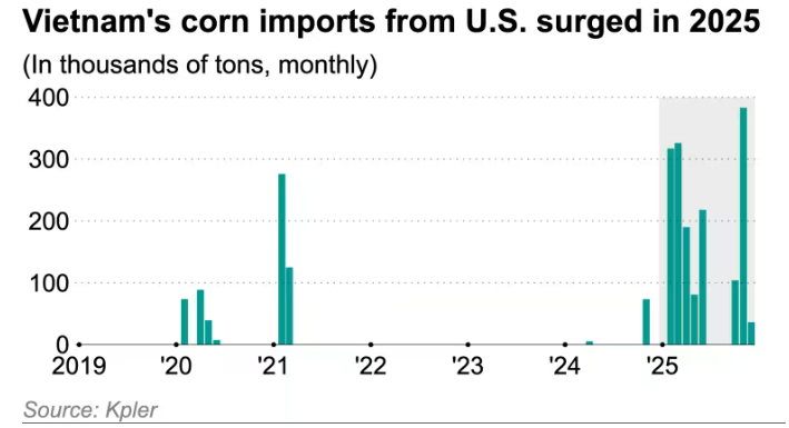 巴努表示:“这是一个非常有趣的现象。越南过去主要进口南美玉米,但2025年却大量采购美国玉米。”