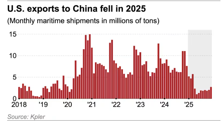 不过,美国向中国的出口暴跌。2025年,美国对中国的出口量从2024年的9300万吨大幅下滑至3200万吨,下降65%。其中大豆交易几乎在2025年5月后完全中止,大豆原本占美国对华出口的30%。