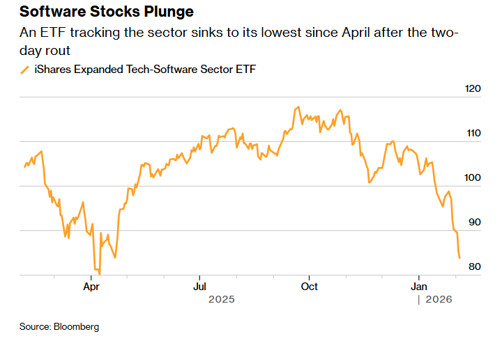 在短短两天内,硅谷大小公司的股票、债券和贷款总市值蒸发了数千亿美元。软件股处于风暴中心,跌幅之深使得追踪行业表现的iShares ETF市值在过去七天里缩水近1万亿美元。