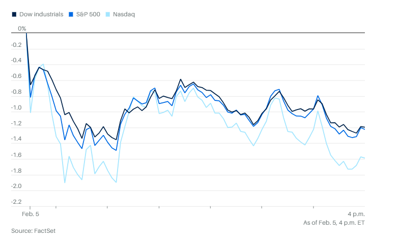 本周的抛售潮蔓延至科技板块之外,道琼斯工业平均指数下跌593点,跌幅1.2%。标普500指数下跌1.2%,连续第三个交易日下跌。。纳斯达克综合指数下跌1.6%。