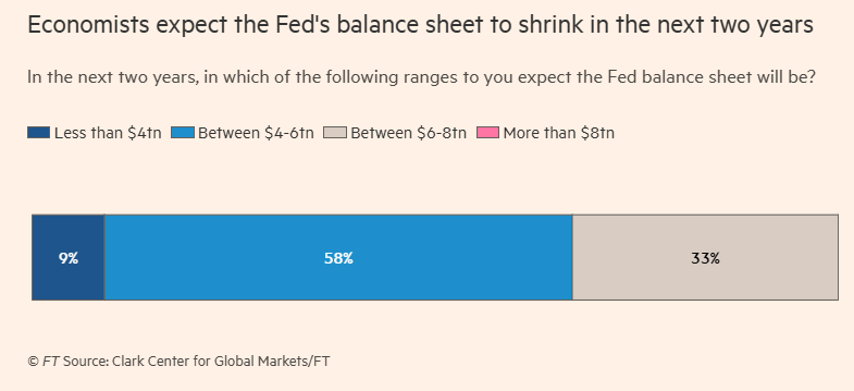 尽管如此,超过四分之三的受访者认为,两年内美联储的资产负债表应缩减至6万亿美元以下。