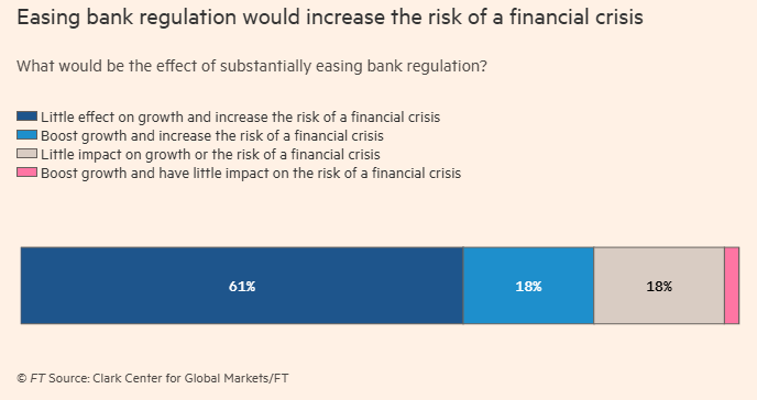 多数受访者并不支持特朗普政府推动、沃什支持的放松银行监管举措。超过60%的经济学家表示,短期内这不会对增长有明显促进作用,反而实质性地增加了金融危机的风险。
