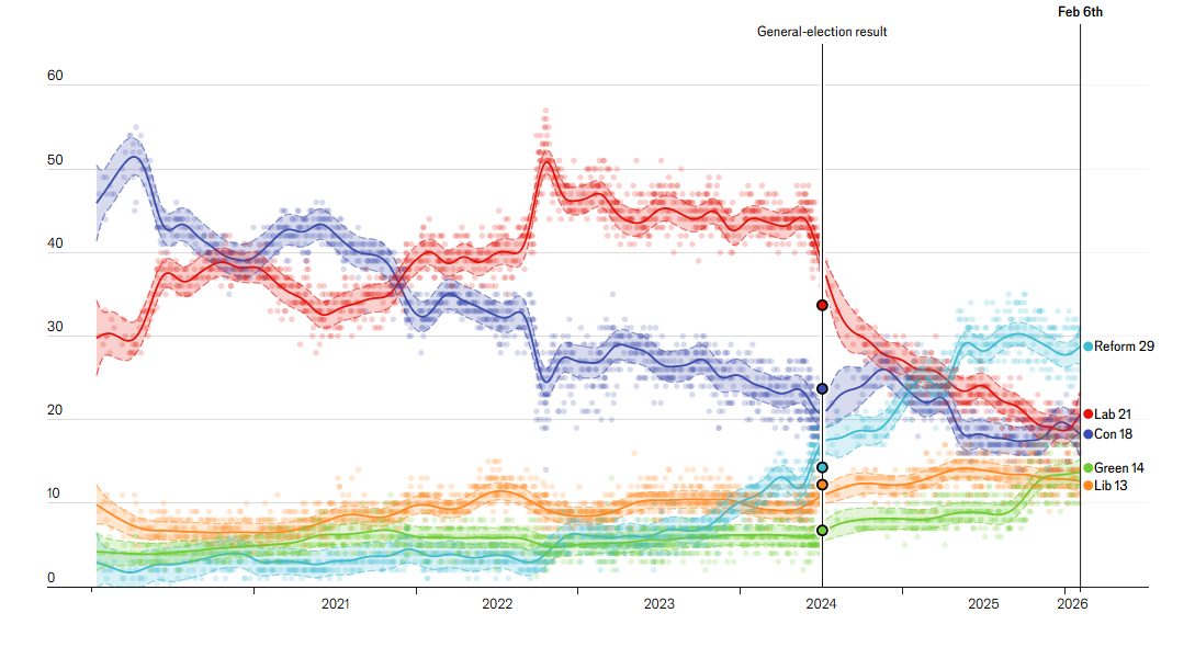 自2023年以来,改革党持续吸纳蓝领选民支持,他们的反欧盟与反移民立场对这类选民具有强烈吸引力。与此同时,工党不仅在蓝领阶层大量失票,在白领群体中的支持率也表现不佳。