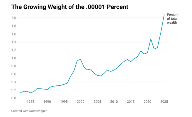 上个月,我采访了加布里埃尔·祖克曼,他是世界领先的财富不平等专家之一。祖克曼一直在制作关于最顶层财富的图表——占比0.00001%,目前意味着19人。他向我分享了最新数据,如下所示: