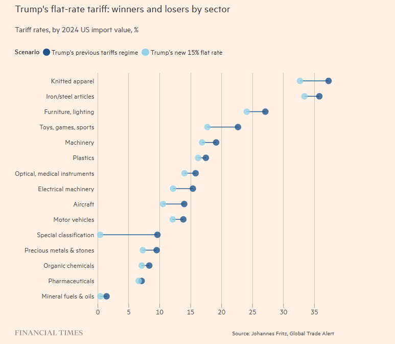 新全球统一税率下最大的输家是英国。英国此前在许多商品上获得10%的关税税率,但现在其平均关税税率将提高2.1个百分点。