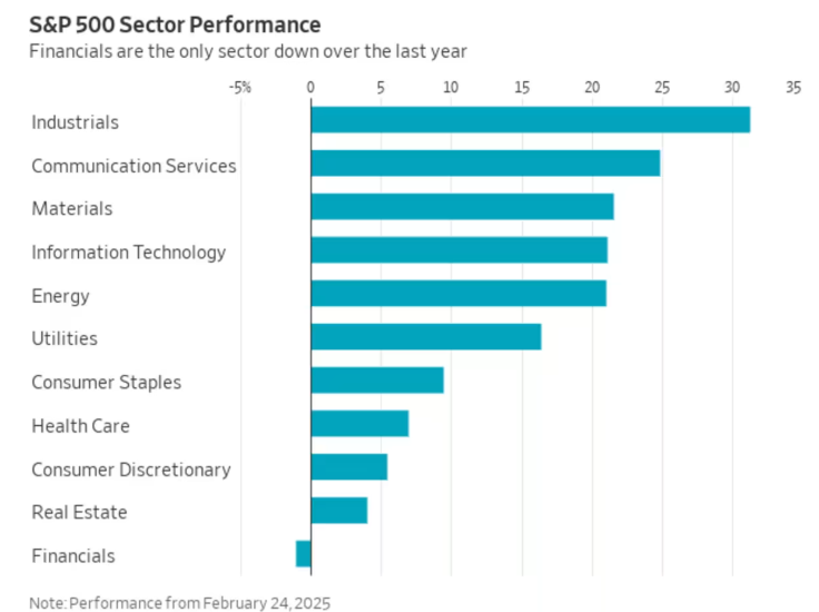 按当前走势看,金融板块可能出现自 2016 年以来最差的年初表现,同时也是标普500各板块中唯一在过去一年中仍处于下跌状态的板块。