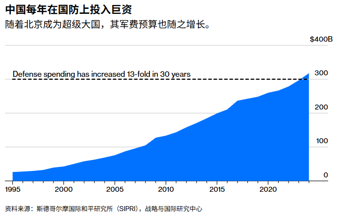 北京会表示自己的国防支出仍远低于美国,但这一差距正在缩小。战略与国际研究中心指出,2012年中国军费大约只有美国的六分之一,到2024年已经上升到约三分之一。