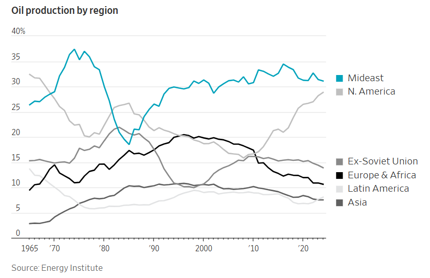中东目前生产全球约三分之一的石油,与20世纪70年代初大致相同。但如今原油市场更加灵活,长期合同减少,交易者也更容易把货物转运到最需要的买家手中。