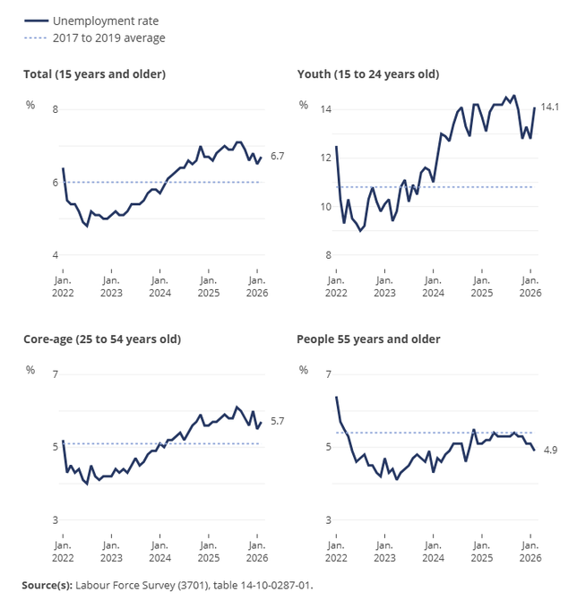 15至24岁年轻人就业减少4.7万人,青年失业率上升1.3个百分点至14.1%。加拿大统计局指出,这一水平“已经接近2025年9月达到的近期高点14.6%”。