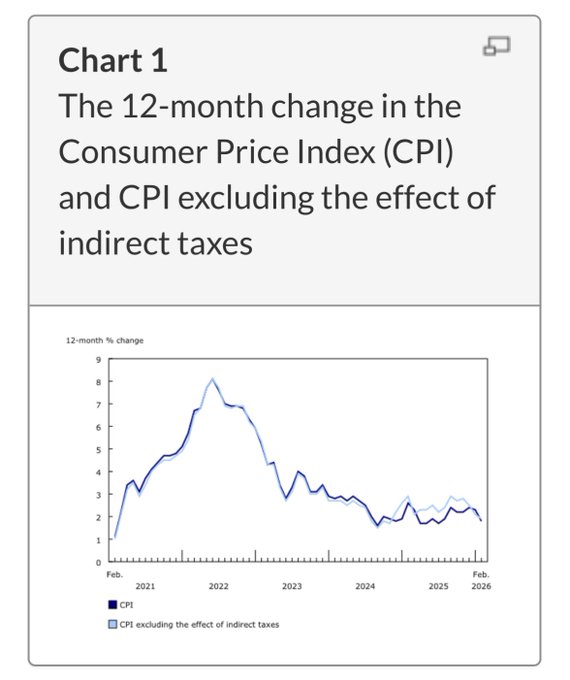 加拿大统计局表示,由于去年联邦“税收假期”的结束削弱了年度价格比较中的上涨压力,2月通胀率年同比从1月的2.3%降至1.8%。这一数字低于经济学家预期的1.9%。