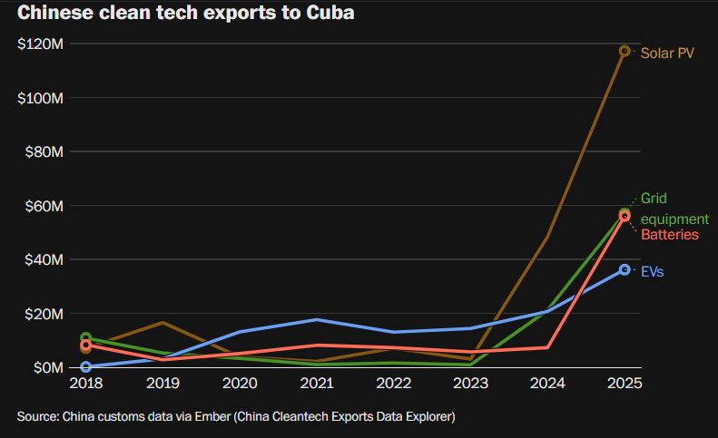 根据英国能源智库“Ember”的数据,中国对古巴的太阳能设备出口,从2023年的约500万美元激增至2025年的1.17亿美元,并且没有放缓迹象。