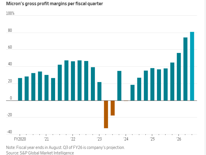 对于一个从事高成本半导体制造的公司来说,这样的毛利率几乎前所未见。根据标普全球市场情报的数据,这将成为美光历史最高水平。但由于存储行业过去经历过周期性下行,加上毛利率不可能超过100%的基本事实,许多投资者担心美光的盈利能力已经或接近见顶。