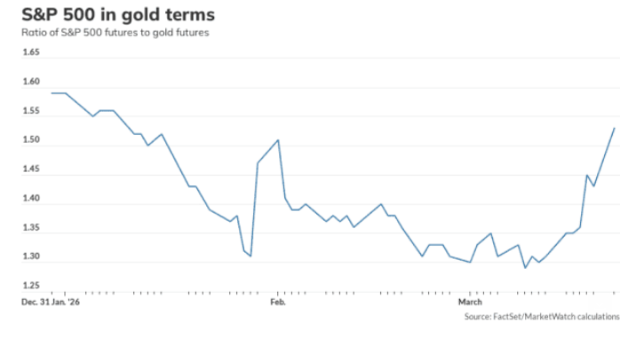 在威尔逊写下这份报告时,他注意到,自三周前冲突开始以来,标普500指数与金价的比率已经上涨了12%。考虑到周一标普500指数和黄金期货的交易水平,这个比率很可能还会进一步上升。