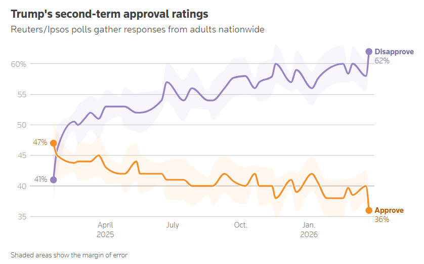 路透社/益普索的最新民调发现,特朗普的支持率近日跌至他重返白宫以来的最低点。