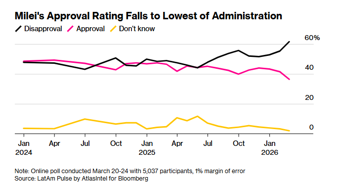根据 AtlasIntel 为彭博新闻进行的“拉美脉搏”调查,米莱的支持率降至36.4%,较2月下降5个百分点;反对率上升6个百分点,接近62%。