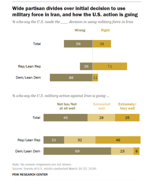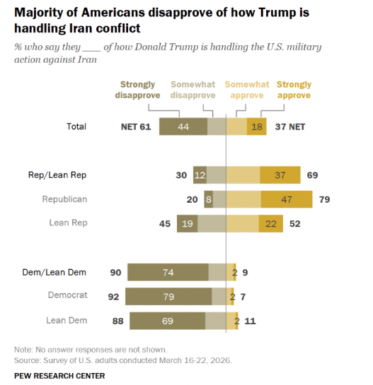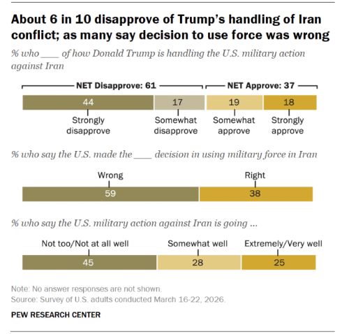 皮尤研究中心于3月16日至22日对3524名美国成年人进行的调查发现,在美国对伊朗展开军事行动数周后,多数美国人认为打击伊朗是一个错误决定,并对特朗普处理这场冲突的方式表示不满。