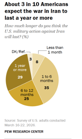 美国人认为与伊朗的战争会持续多久?略多于一半的美国人(54%)认为,美国对伊朗的军事行动至少还会持续六个月,其中29%认为会持续一年或更久。