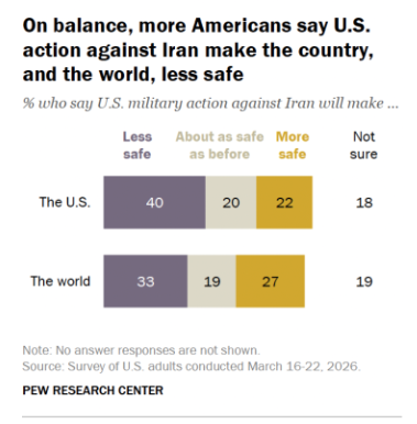 这场战争会让美国和世界更安全还是更不安全?从整体来看,认为对伊朗的军事行动会在长期让美国更不安全的人(40%)明显多于认为会更安全的人(22%)。约两成认为不会有变化,另有18%表示不确定。