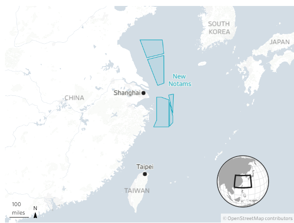 过去中国一些演习的重点,是控制在台海潜在冲突中美国军方可能使用的航线。美国海军战争学院中国海事研究所主任克里斯托弗·沙曼表示,这些保留空域,可能“为演练那种情境下所需的空战机动提供机会”。