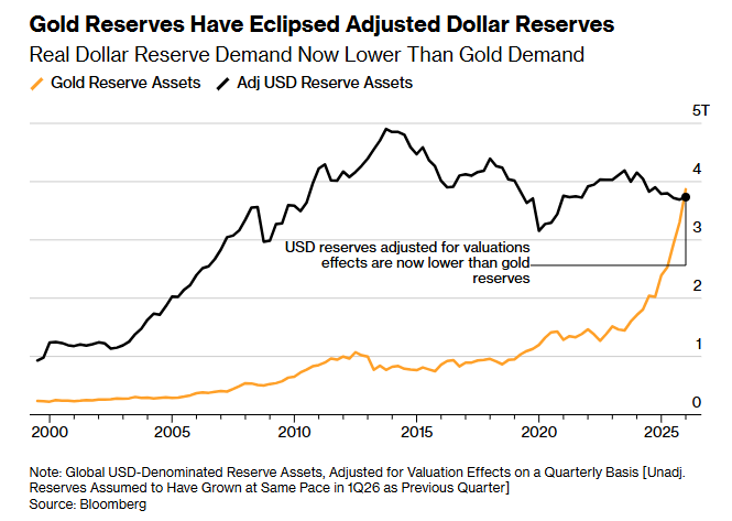 美国与伊朗的战争对全球贸易体系造成了可能不可逆的压力。经估值调整后,数十年来,黄金储备首次超过了各国央行持有的美元资产规模。